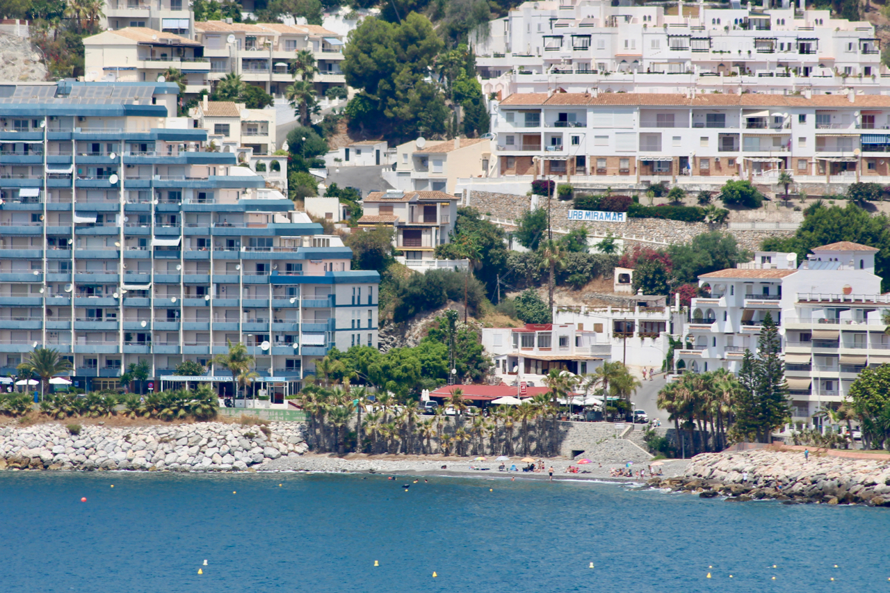 Die Promenade der großen Kieselsteine liegt etwas höher als der Strand, hinter der Straße erheben sich große Apartmentwohnhäuser der Urbanisation Miramar. Der Playa El Rincón de la China ist der Strand zwischen der Steilküste im Westen und der Ebene von Almuñécar im Osten.